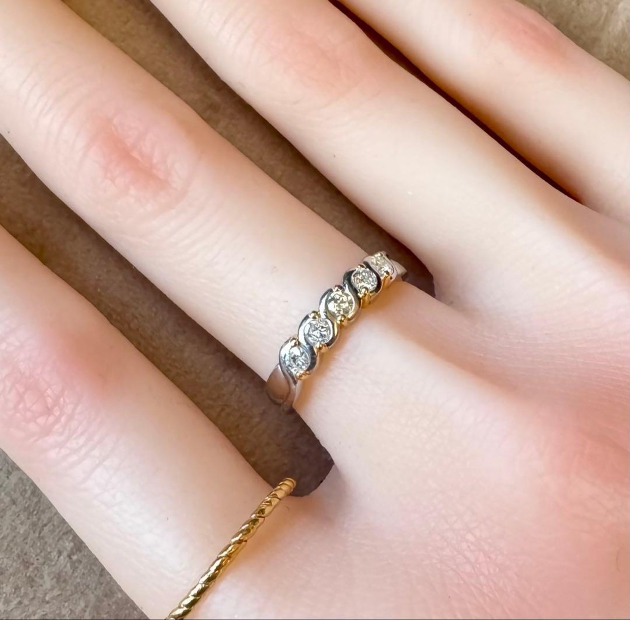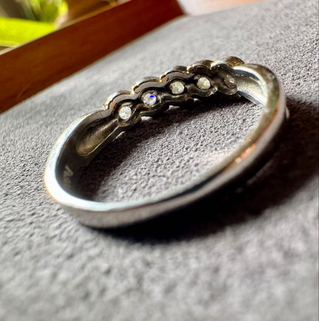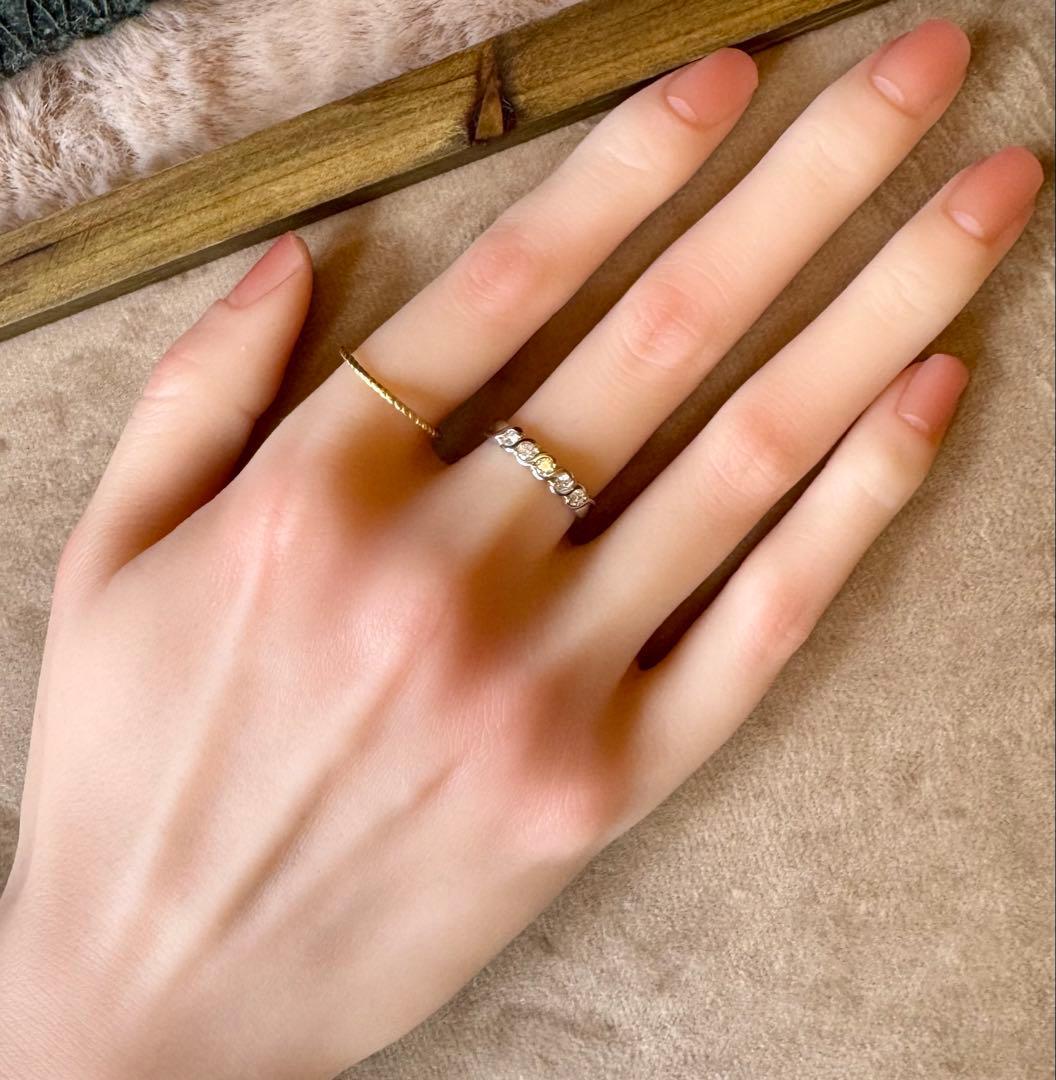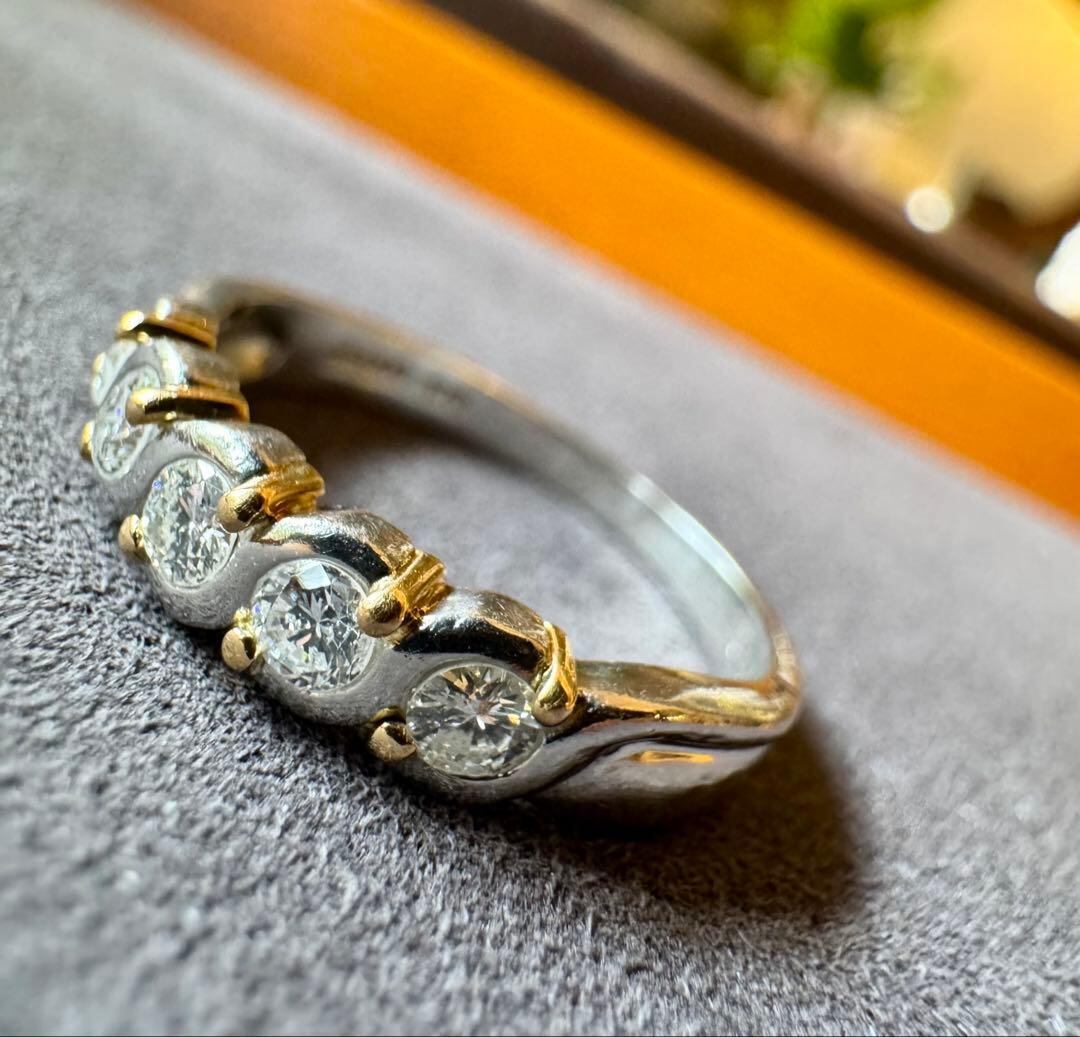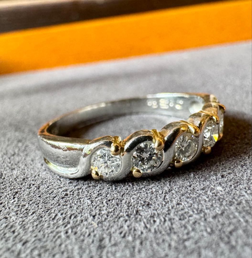 Pt900とK18のツイストデザインにダイヤモンド5石が輝くコンビリングです✦