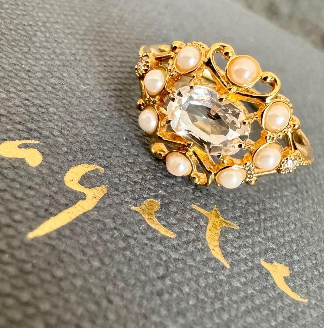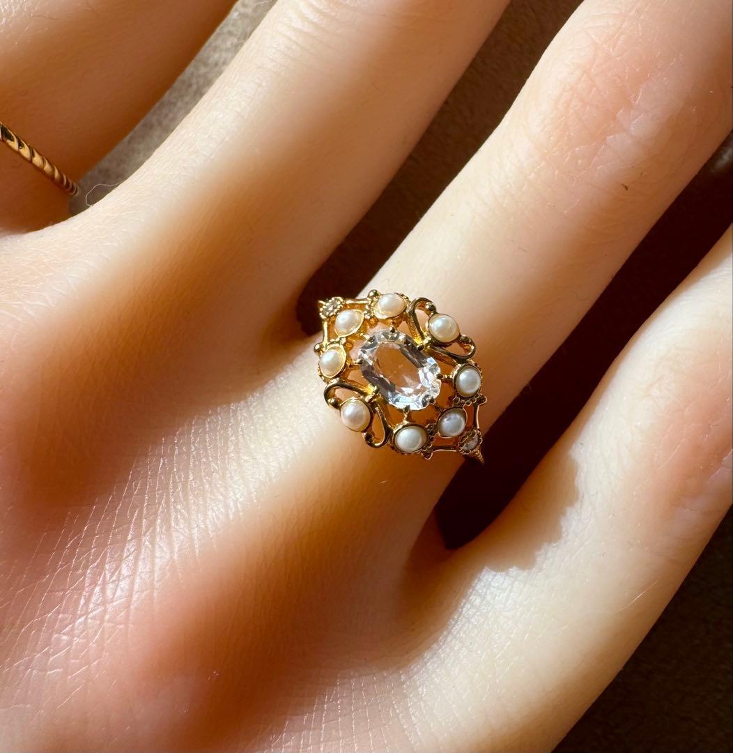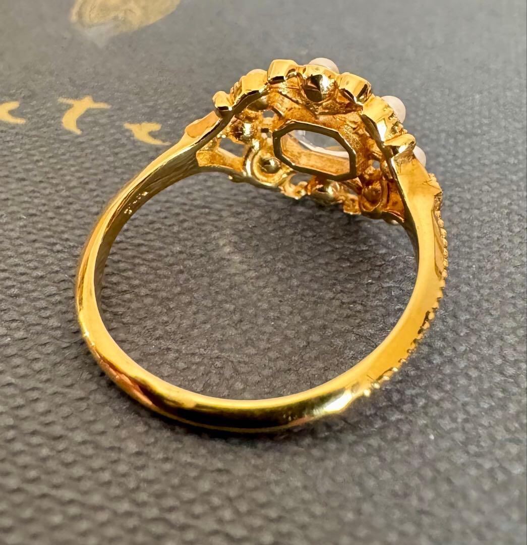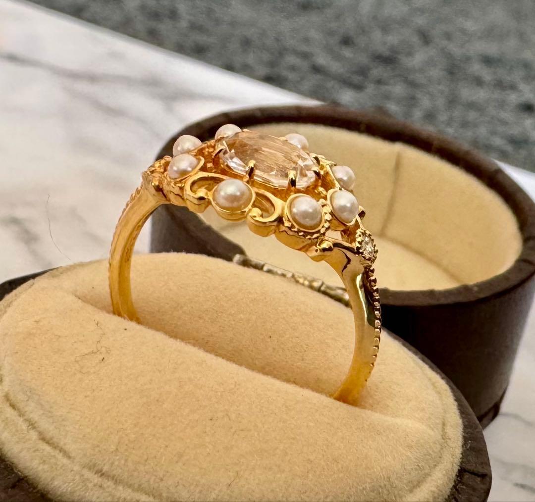 agete◆K18YG*11号*クォーツ×パール*ストレートリング*アガット