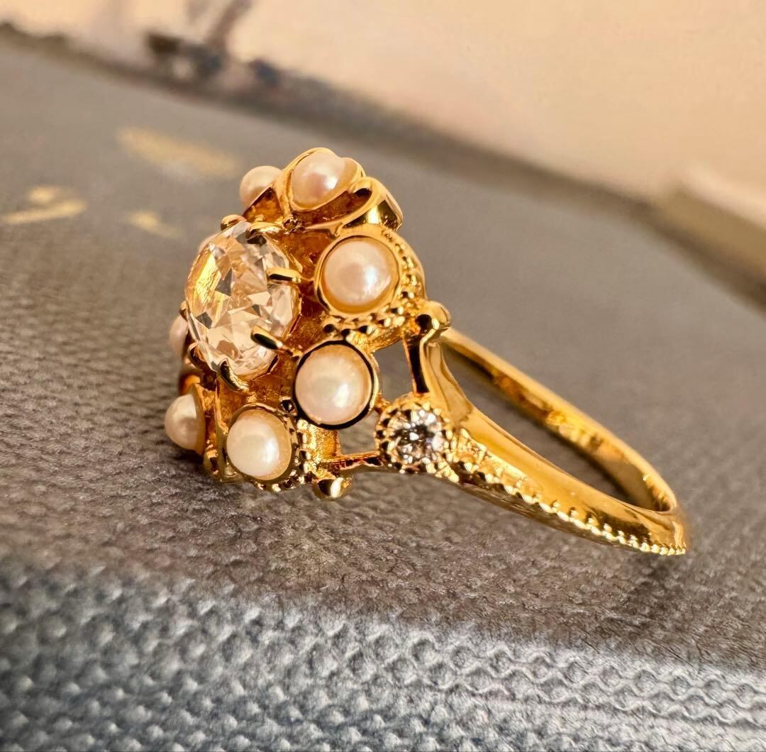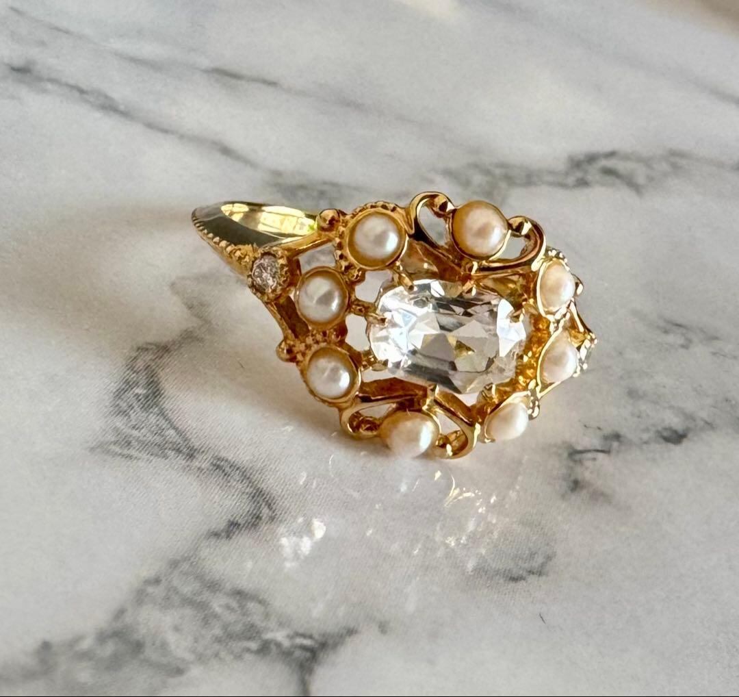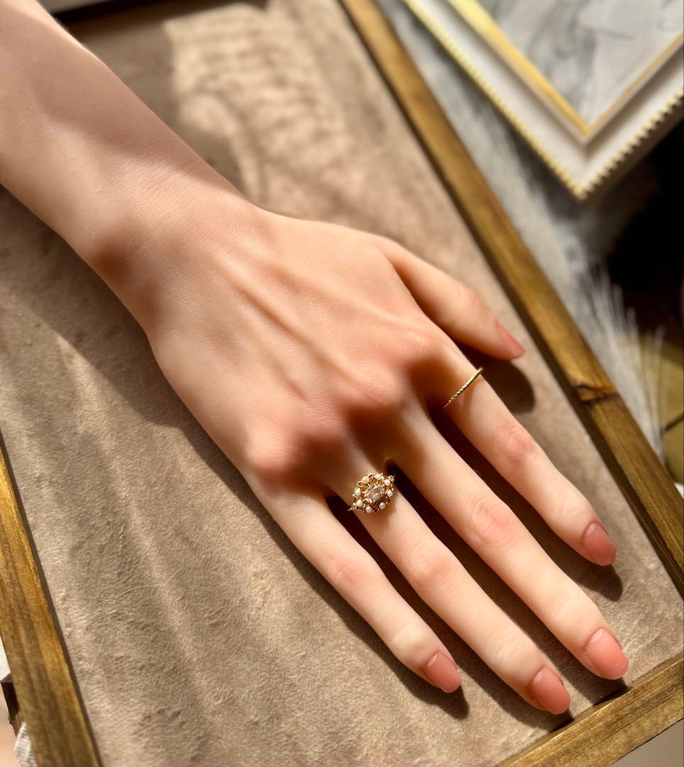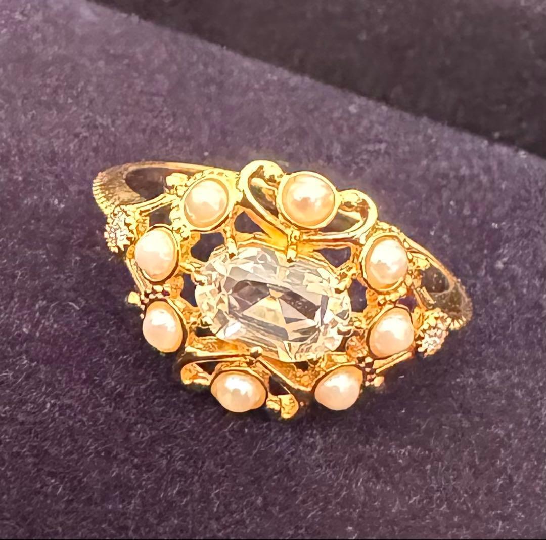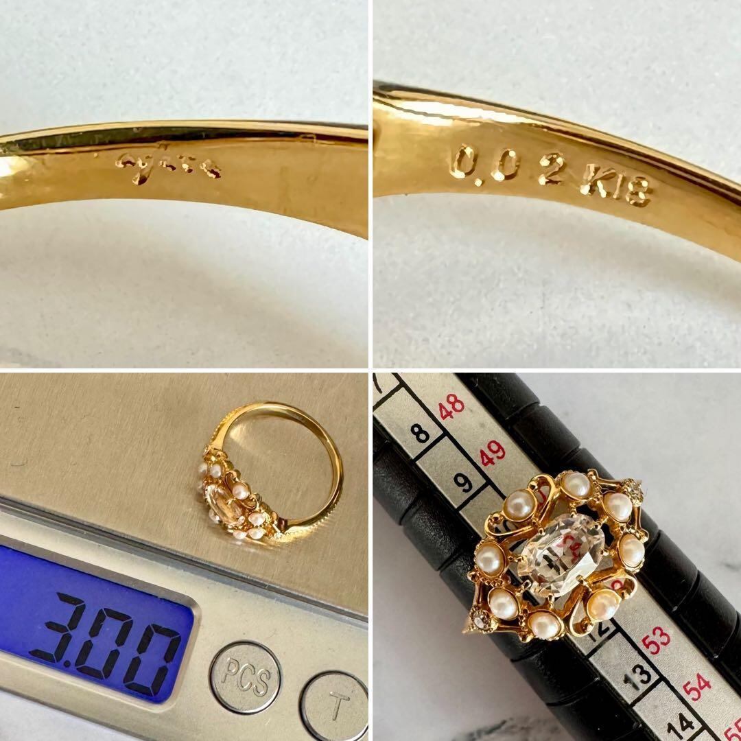 agete◆K18YG*11号*クォーツ×パール*ストレートリング*アガット