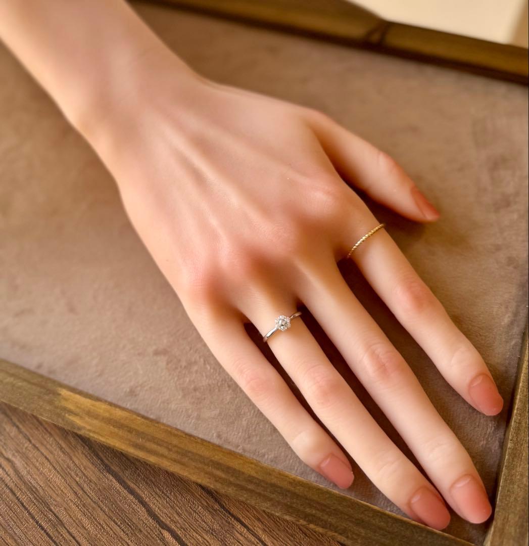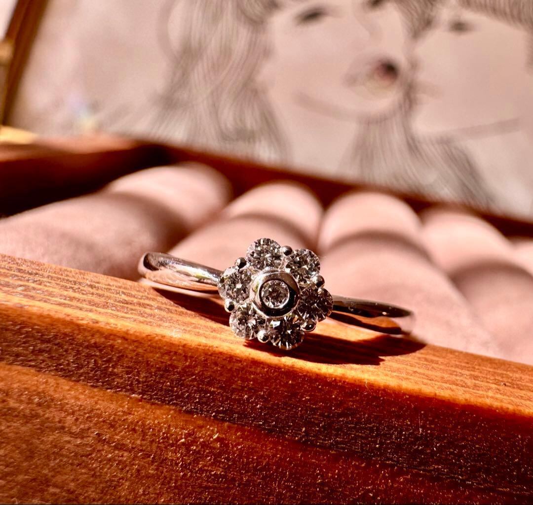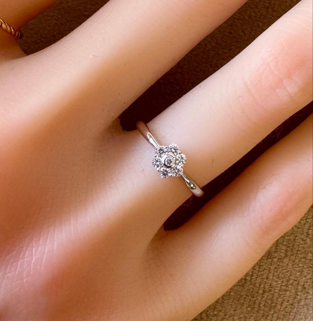 無色に近いダイヤモンドの輝きも素晴らしく、シンプルなラインでありながら可愛らしさもあるデザイン♪お手元に輝きを✦