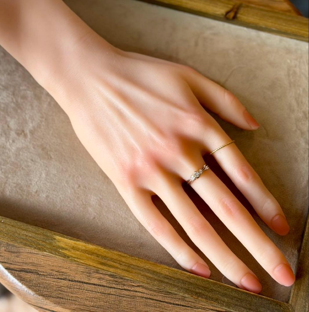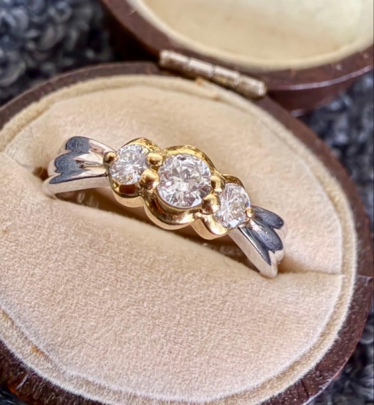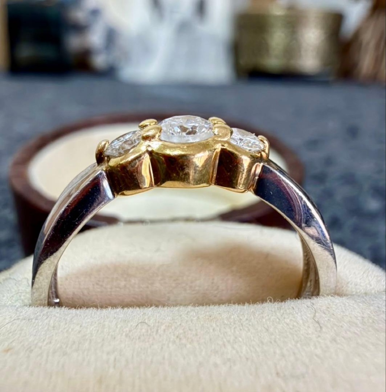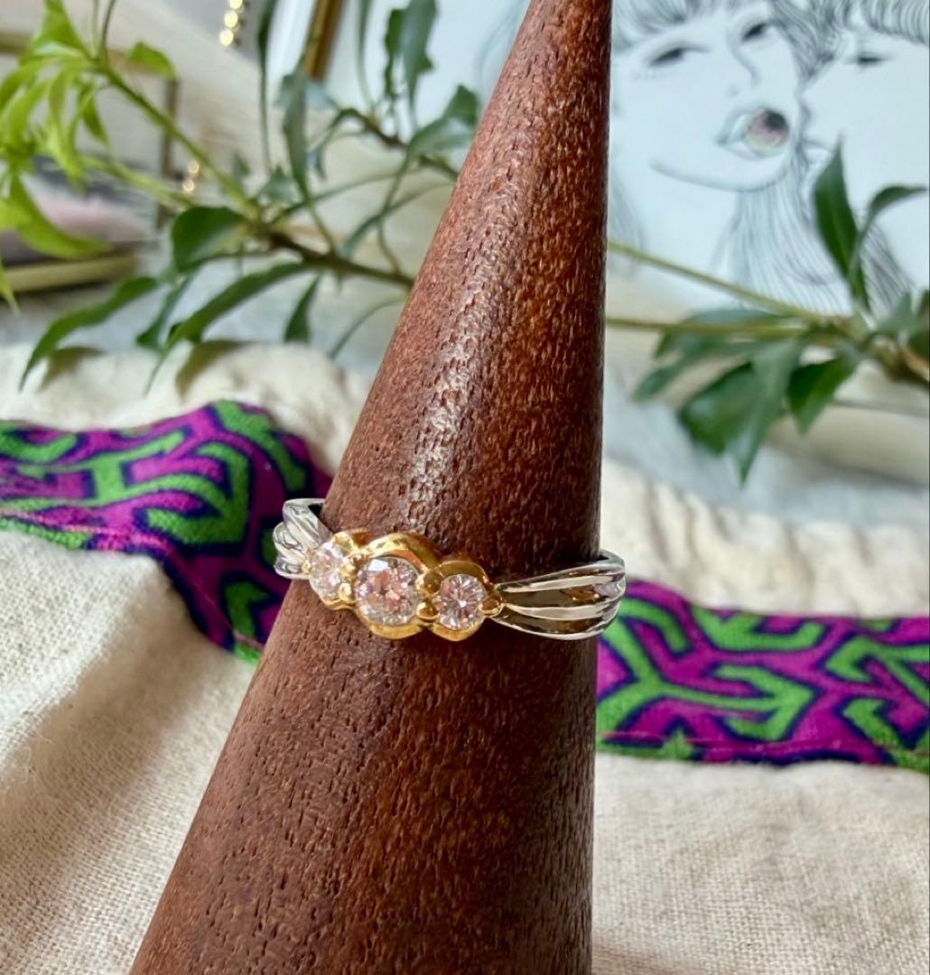 K18YG地金に囲まれた3粒のダイヤモンドとプラチナ地金アームのコンビリングです✦