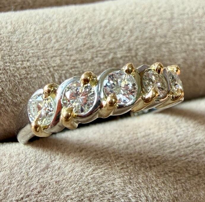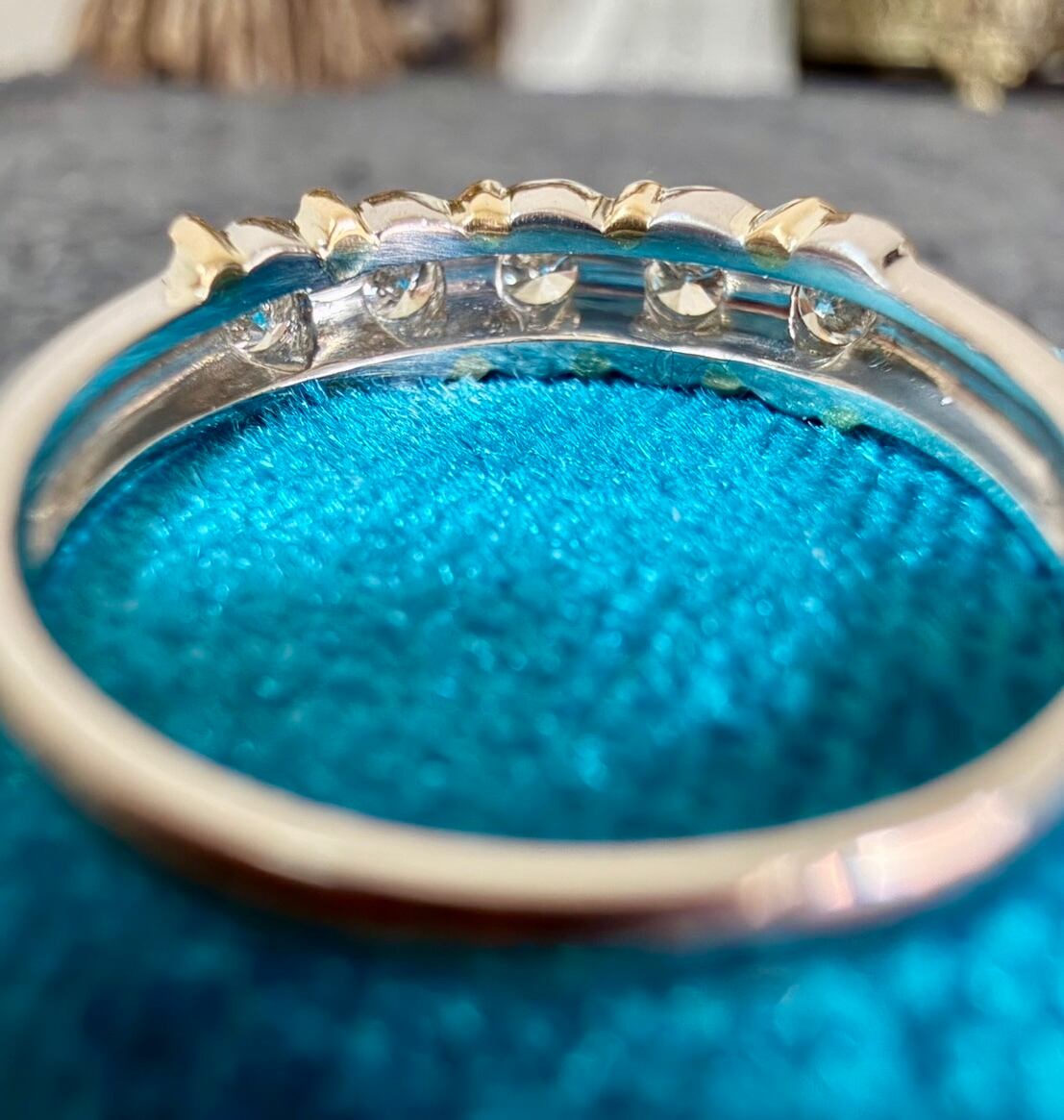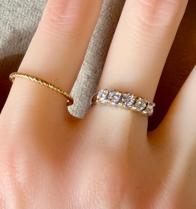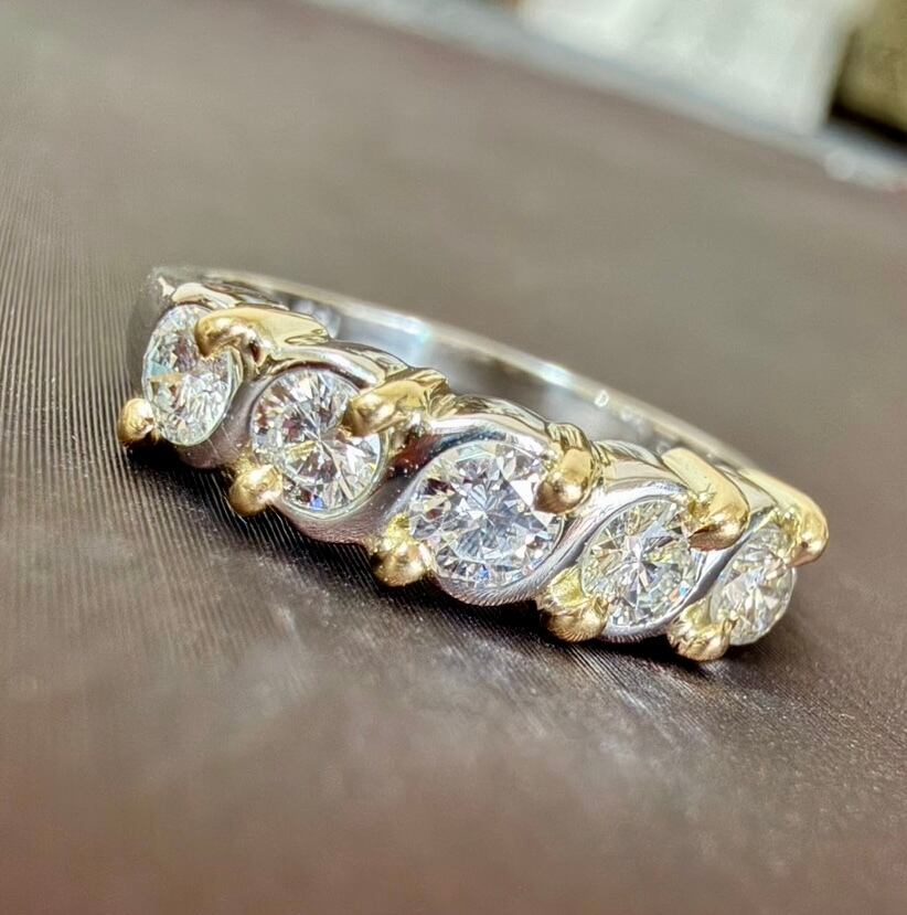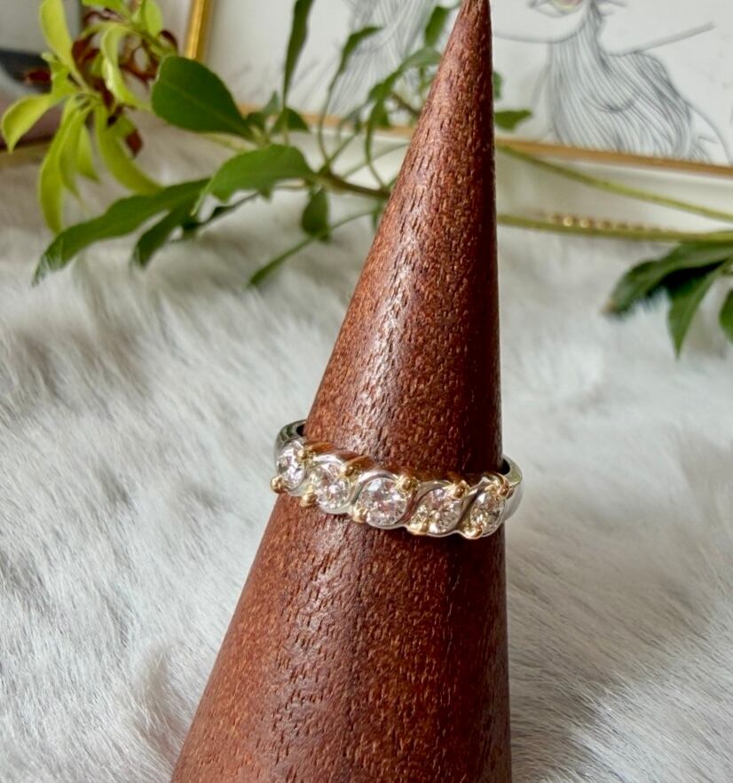Pt900とK18のツイストデザインにダイヤモンド5石が輝くコンビリングです✦