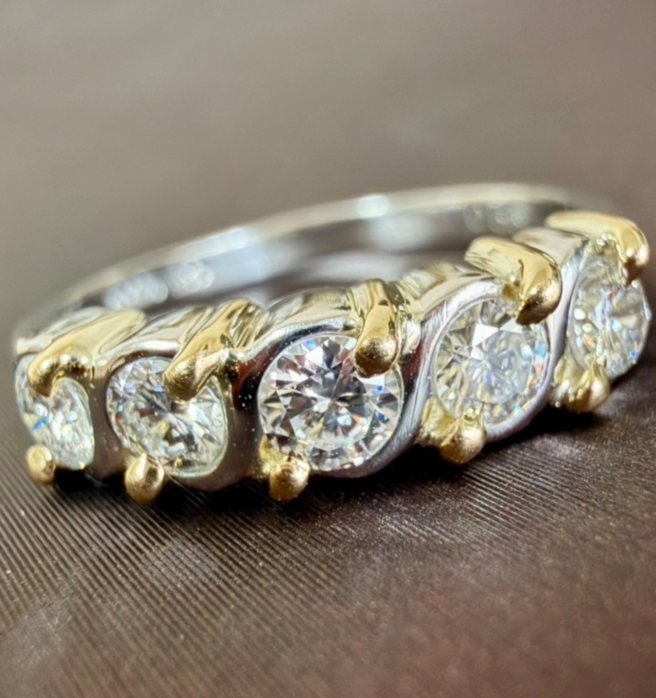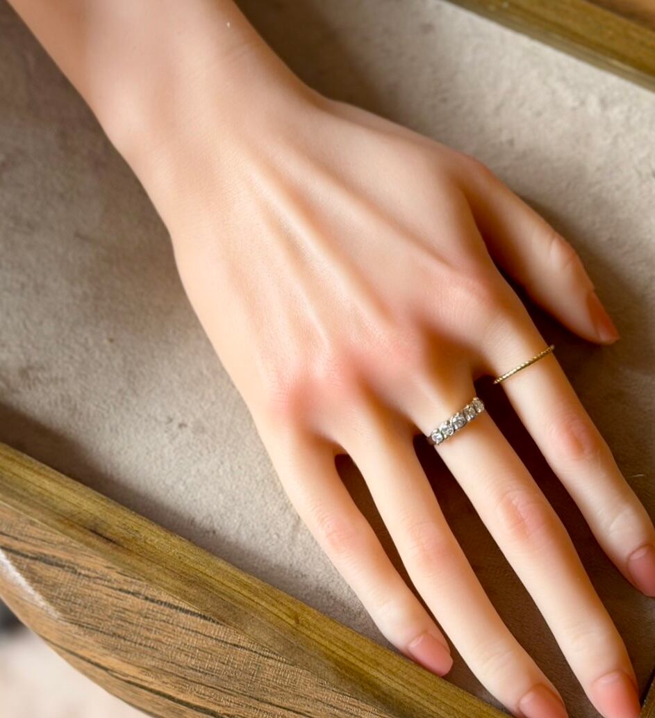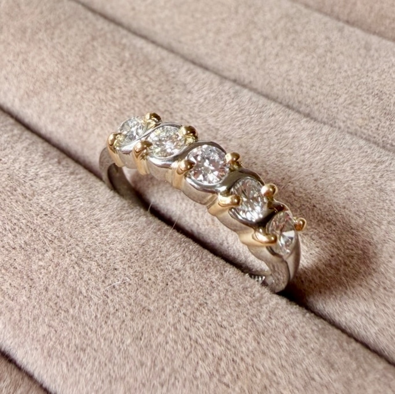 Pt900とK18のツイストデザインにダイヤモンド5石が輝くコンビリングです✦
