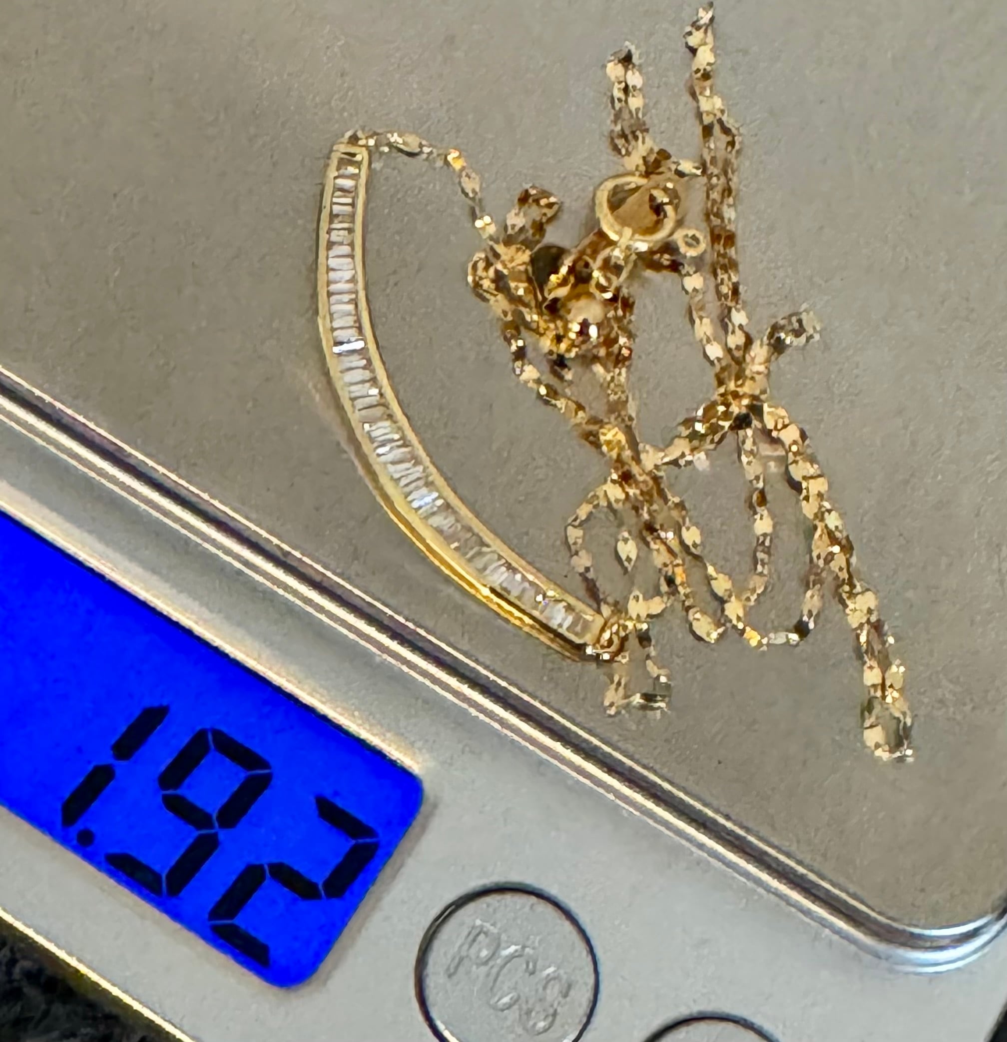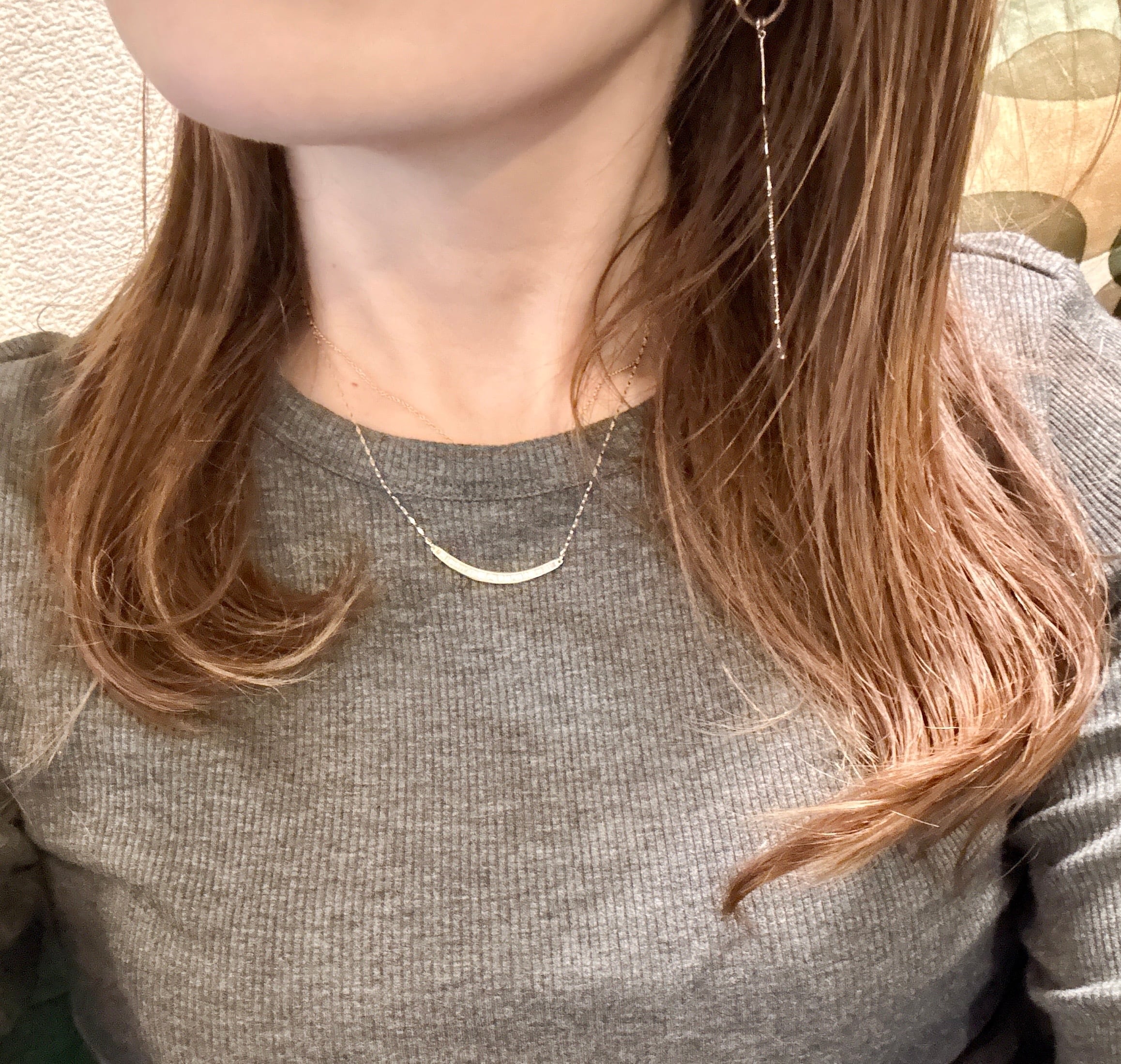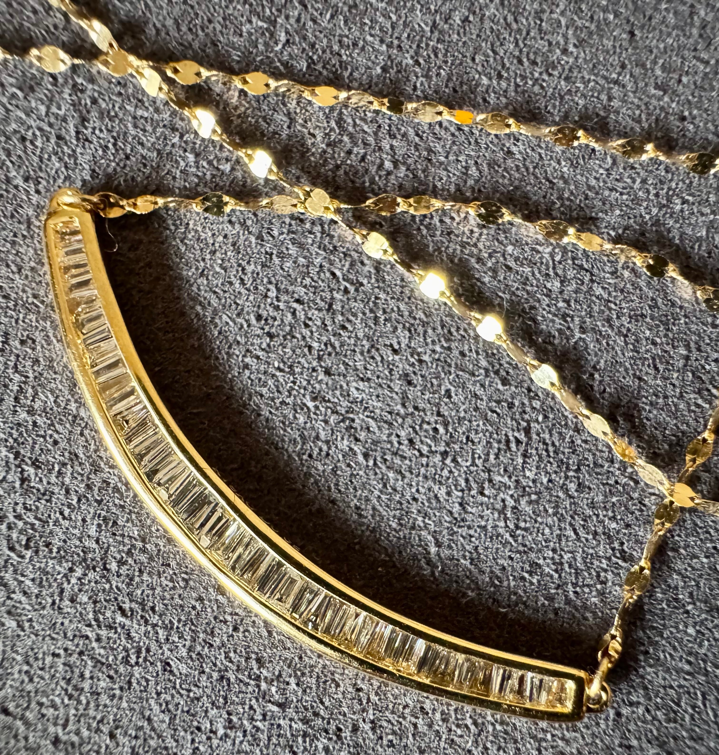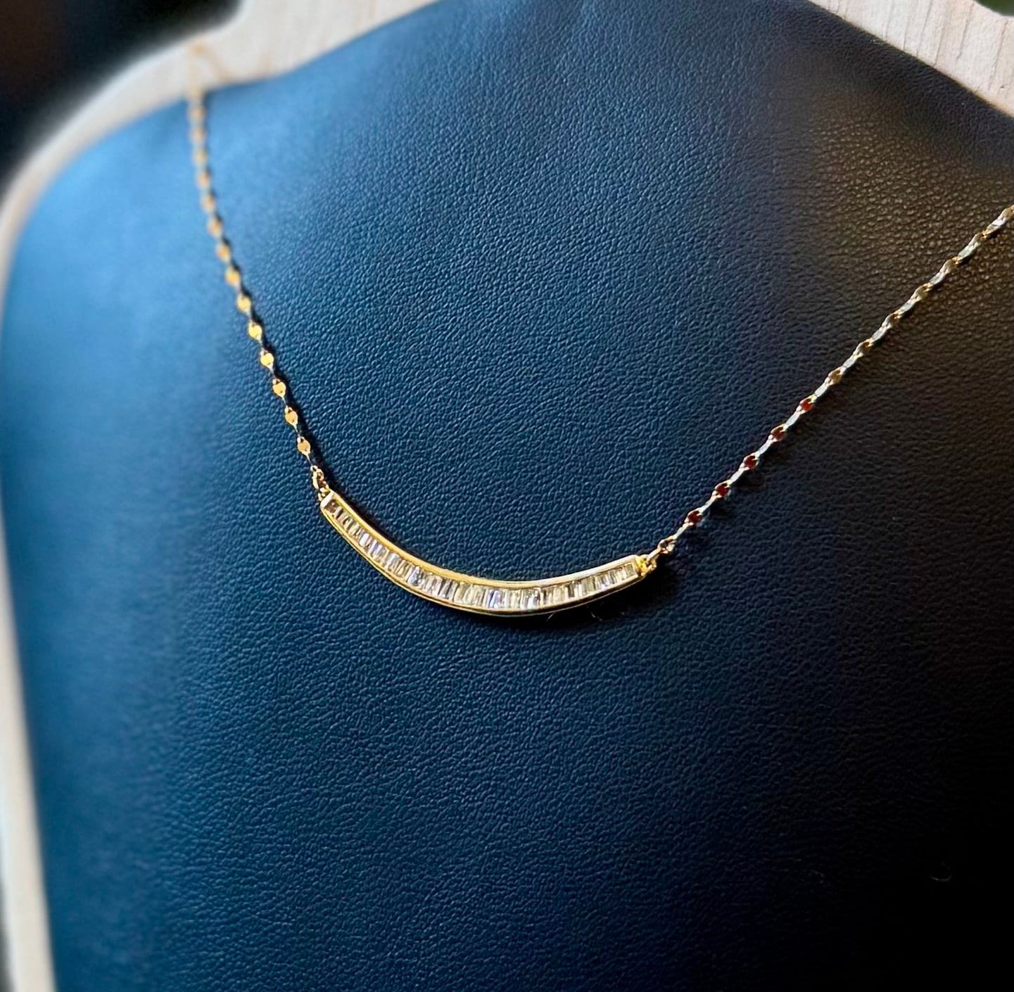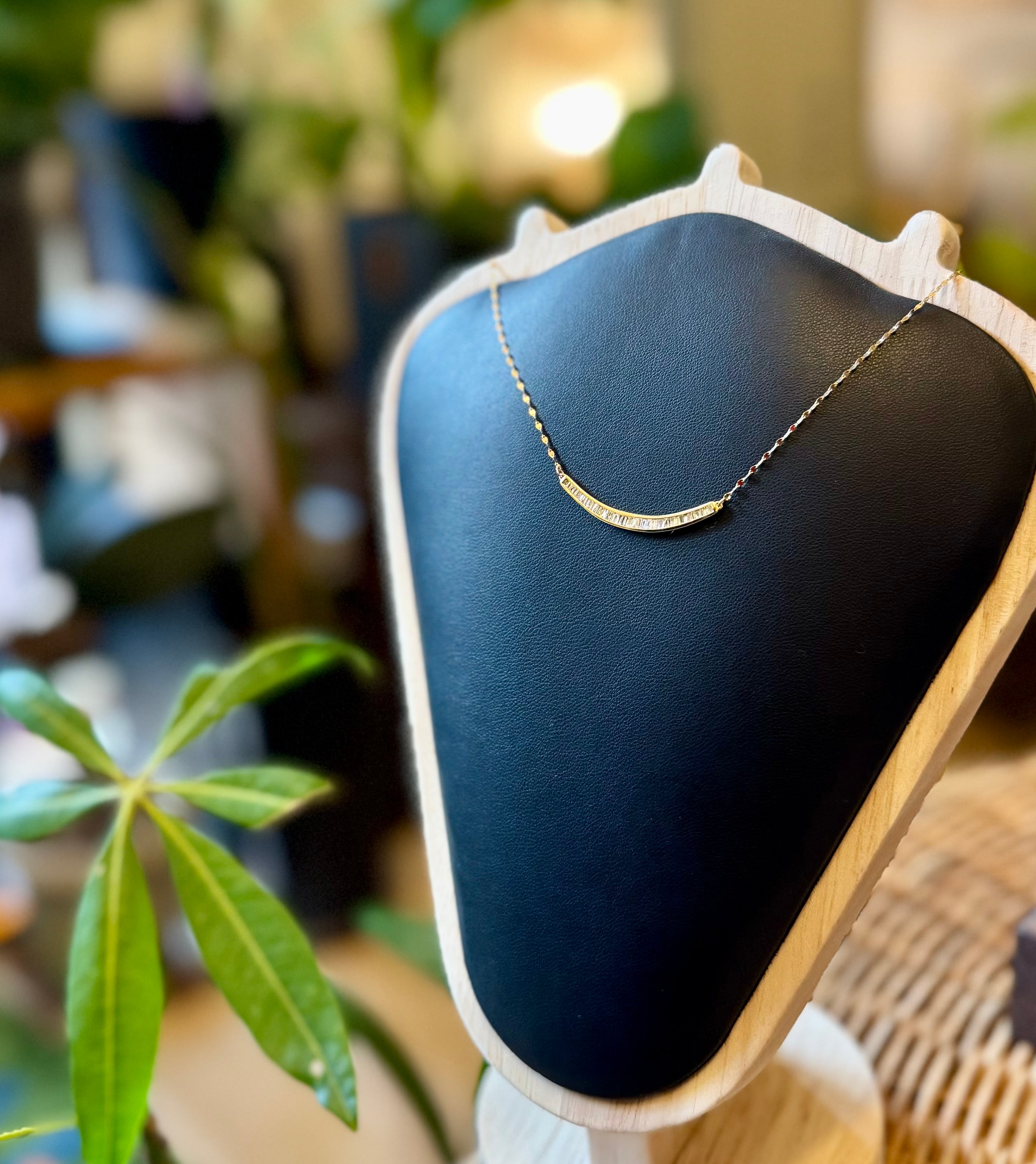 ゆるやかウェーブアームに0.25ctのテーパーカットダイヤモンドがセットされたネックレスです✦