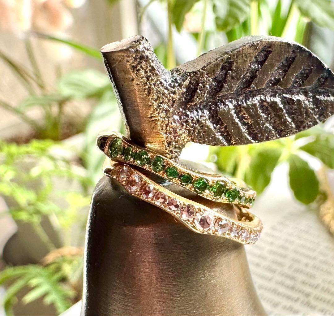 地層をイメージした動きのあるデザインに、シャンパンゴールドの落ち着いた色合い・マット加工アームに24面体のローズカットダイヤモンド!