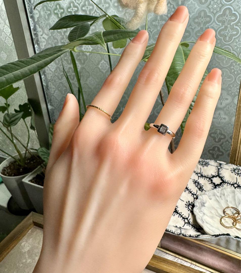 輝きも素晴らしいプリンセスカットダイヤモンドを厚めの地金で囲んだリング。