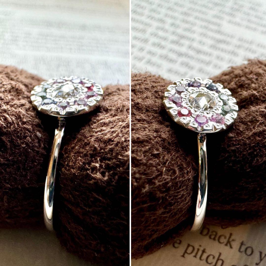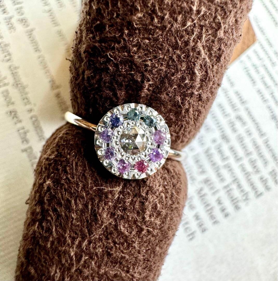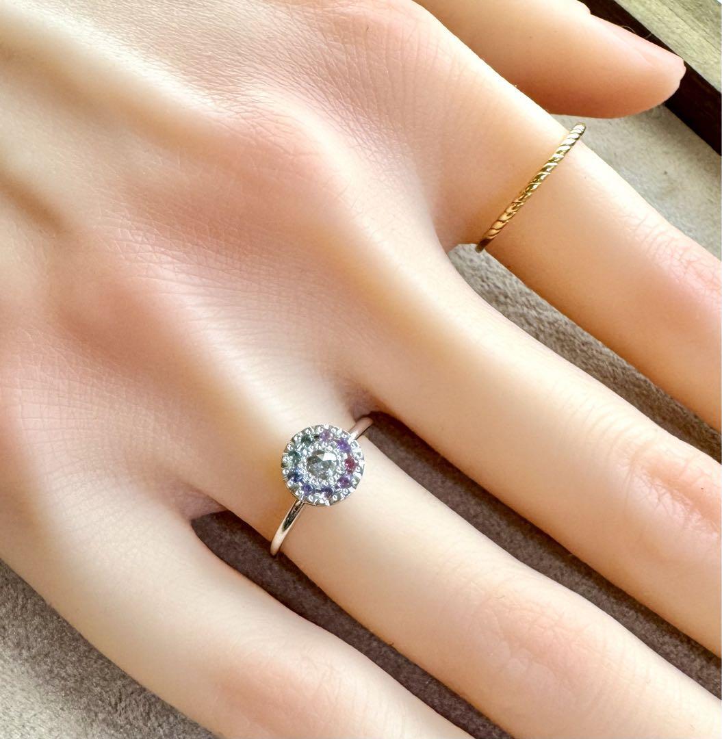 真ん中に0.05ctのローズカットダイヤモンド、その周りにはマルチカラーサファイアで囲った可愛いガーランドリングです♡