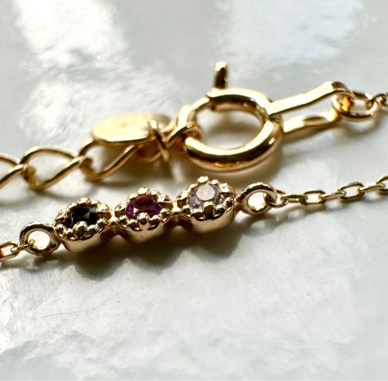 華奢チェーンとミルグレインに囲まれた色石はフェミニンな印象でお手元を上品に見せてくれますよ✦