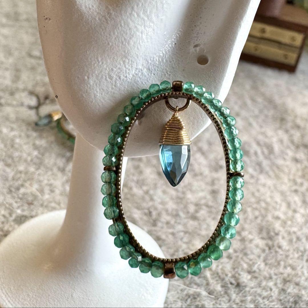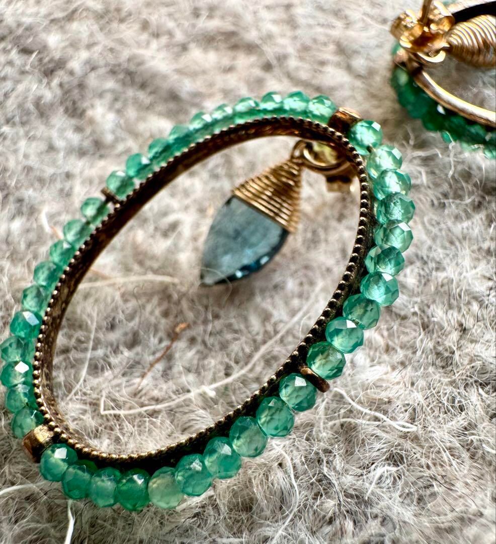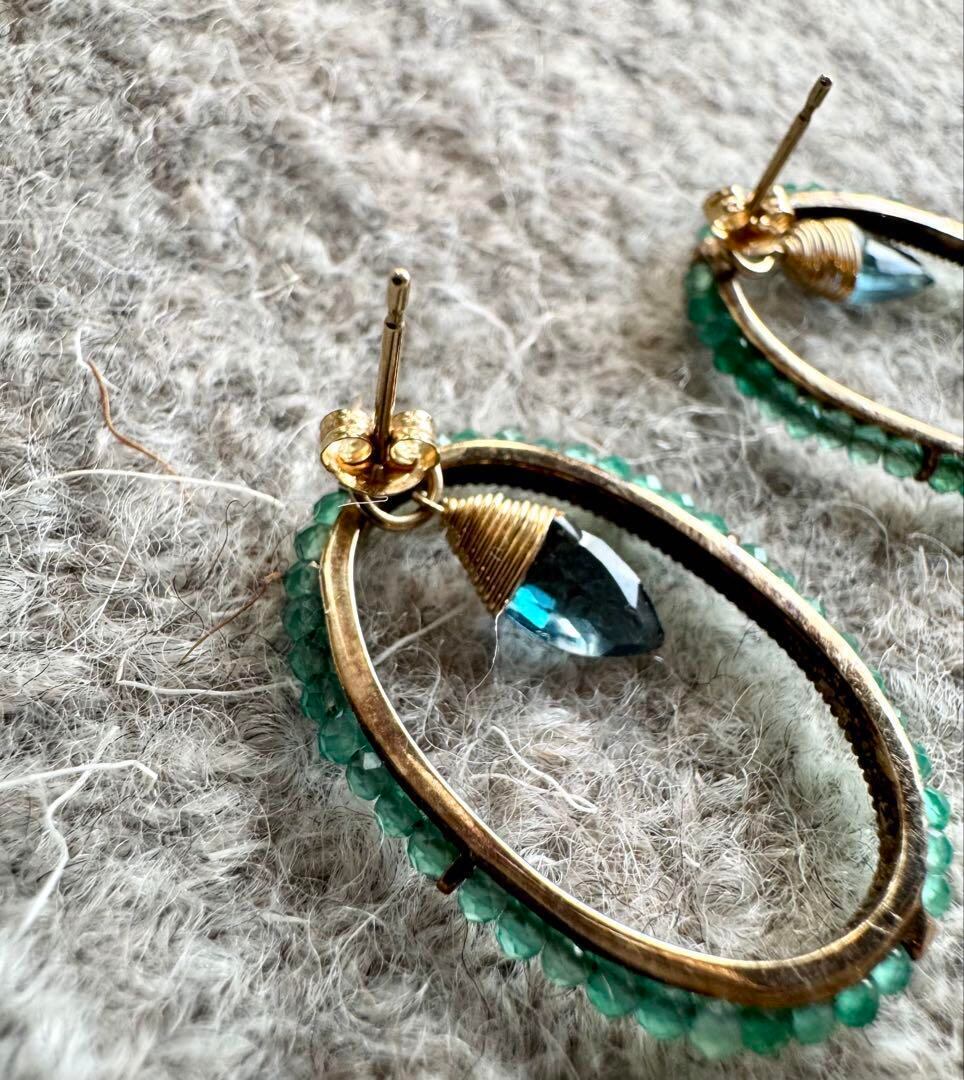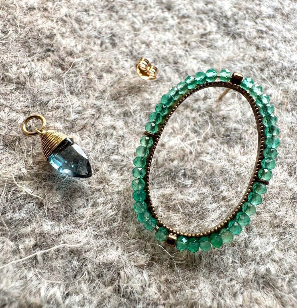 地金と半貴石を色彩豊かに合わせて組み上げた繊細なつくりで、Evaが全てひとりでハンドメイドで仕上げています。