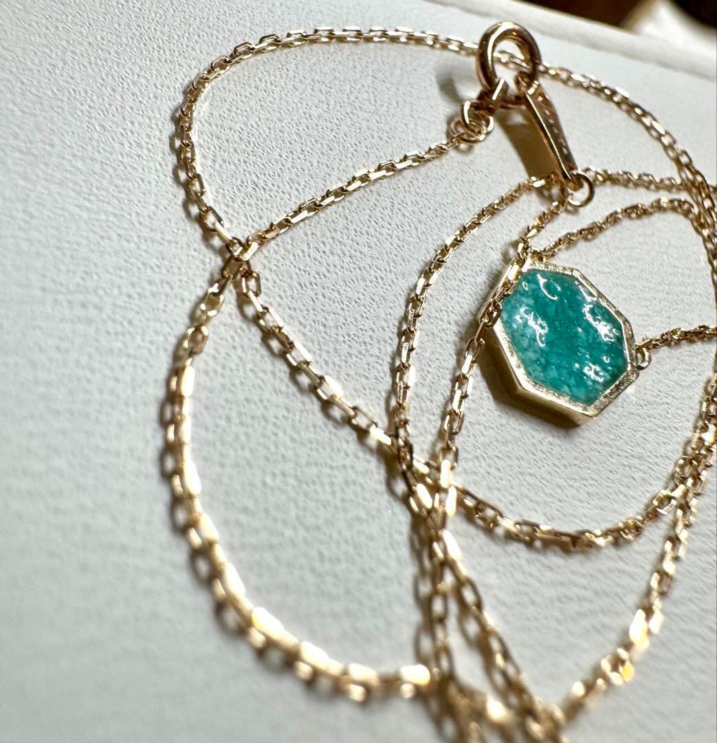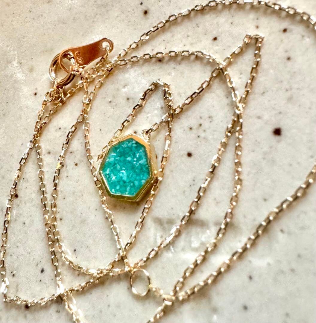 歪なヘキサゴン型に水色のローマンガラスが素敵にマッチしたペンダントネックレスです✦