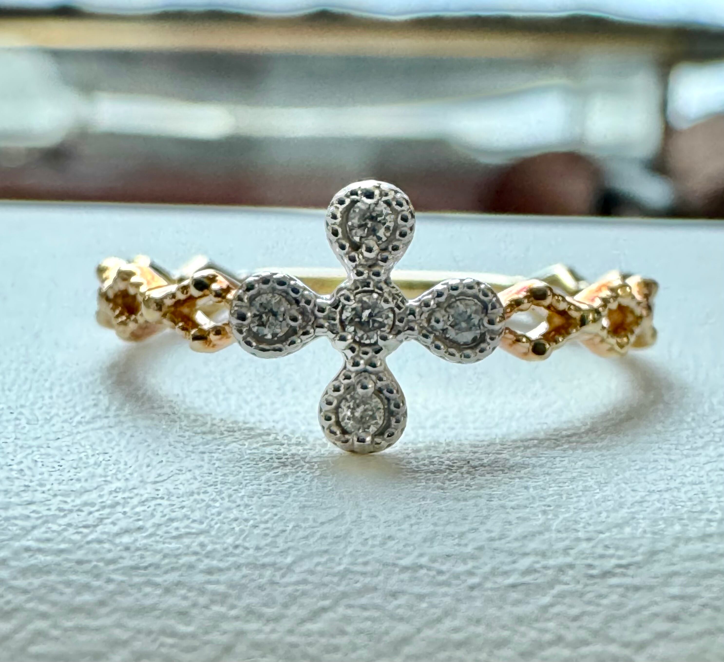 十字モチーフには5Pのダイヤモンドがミルグレインにてセット、アーム部分は透かし模様です♪