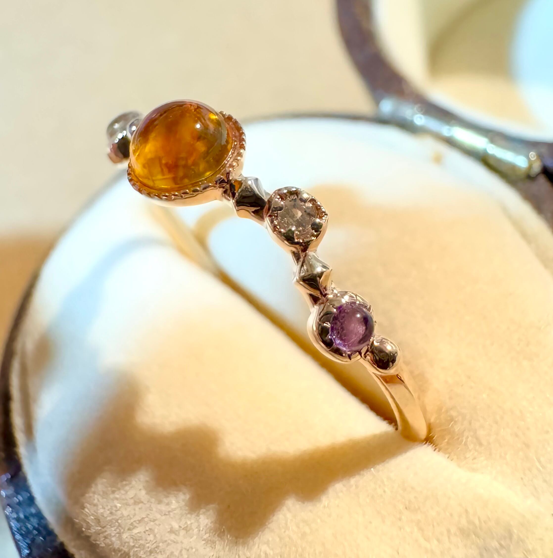 トップストーンはアンバー(琥珀)、両サイドはアメジスト、ムーンストーンが使用されています。