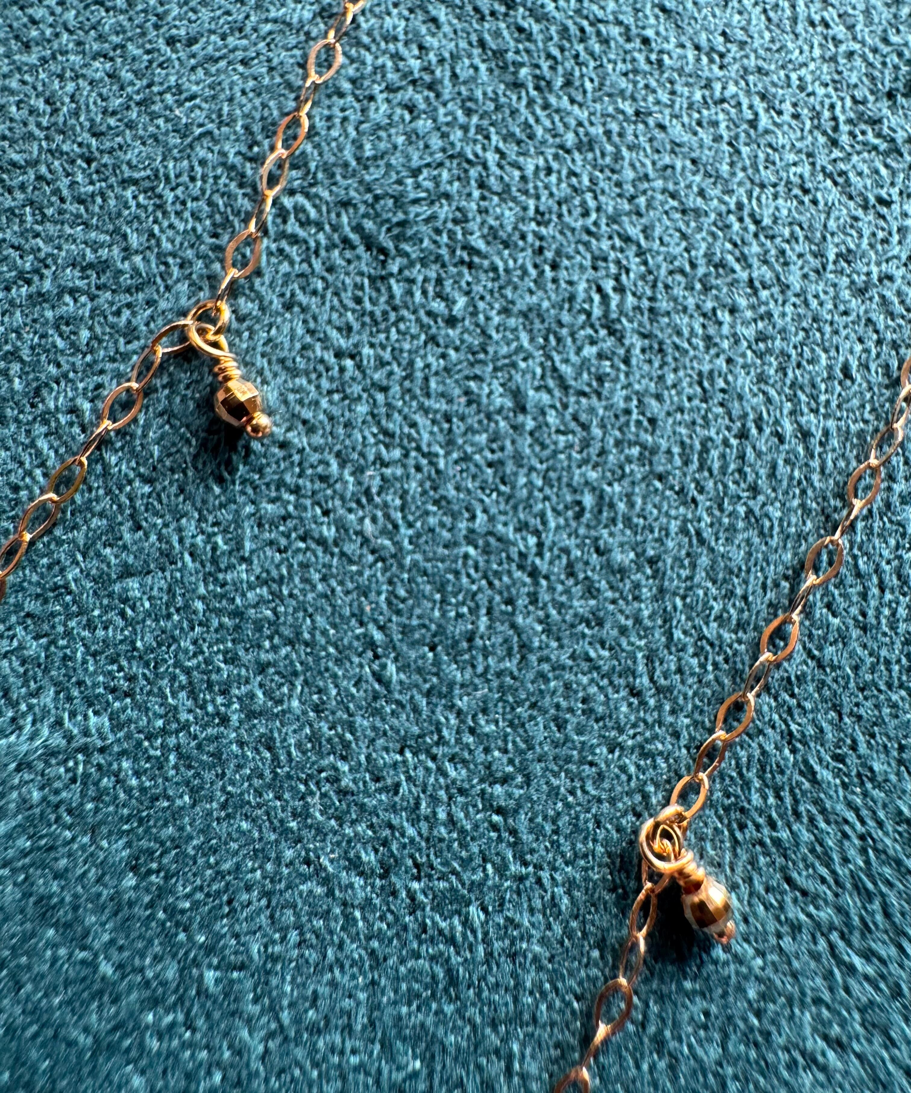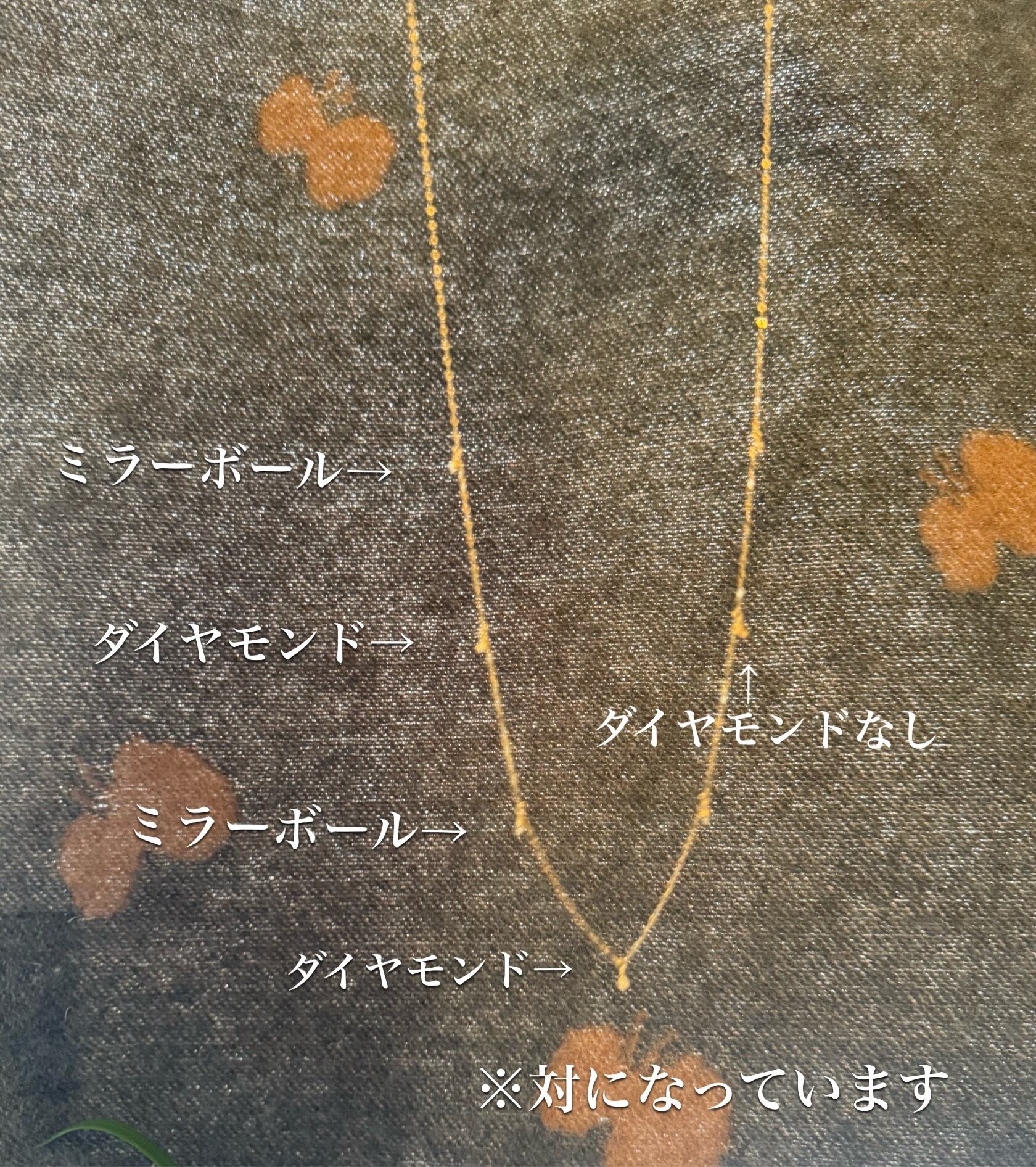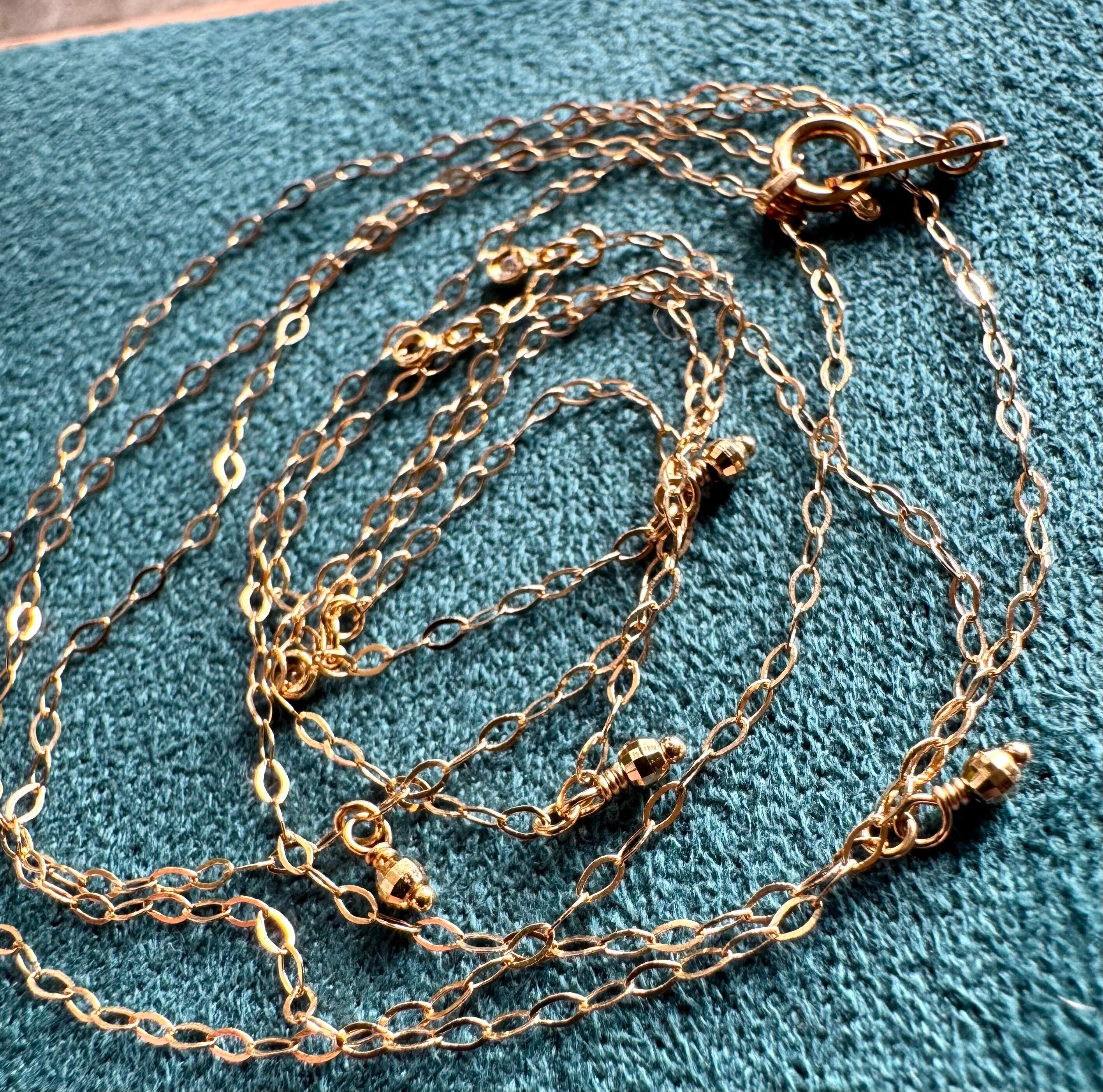 華奢なネックレスチェーンに、等間隔にセットされたミラーボール・ダイヤモンドがアクセントになったロングタイプ。