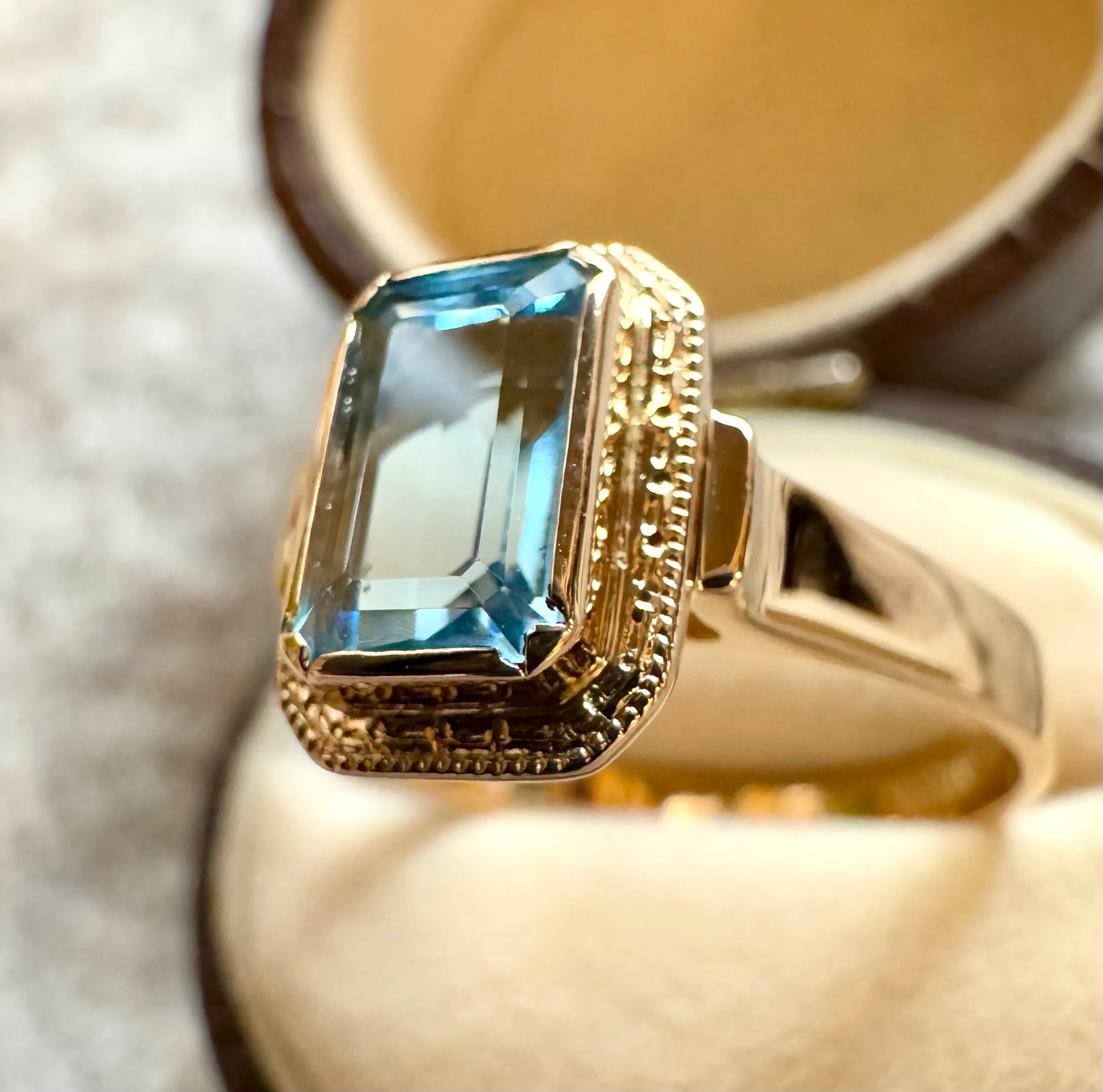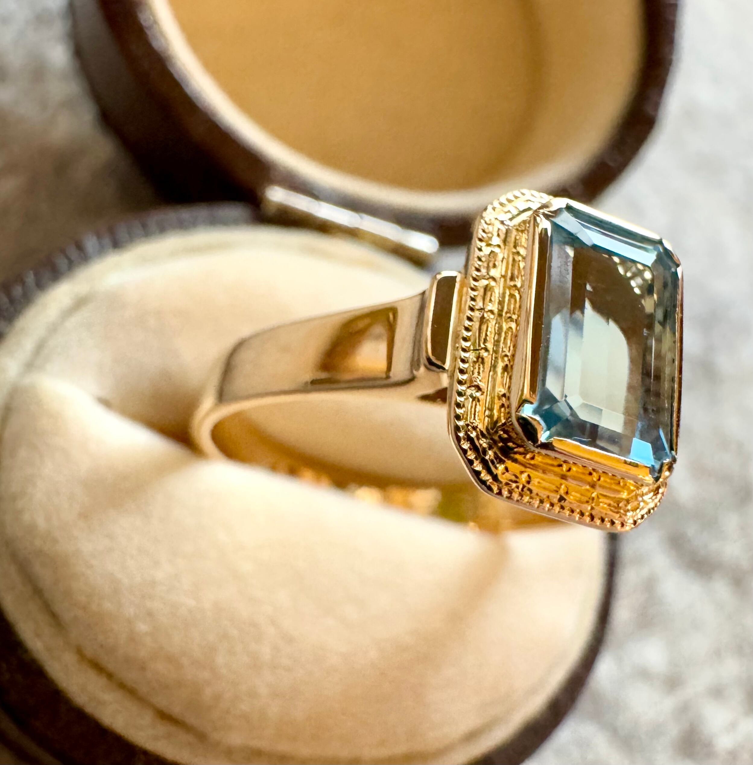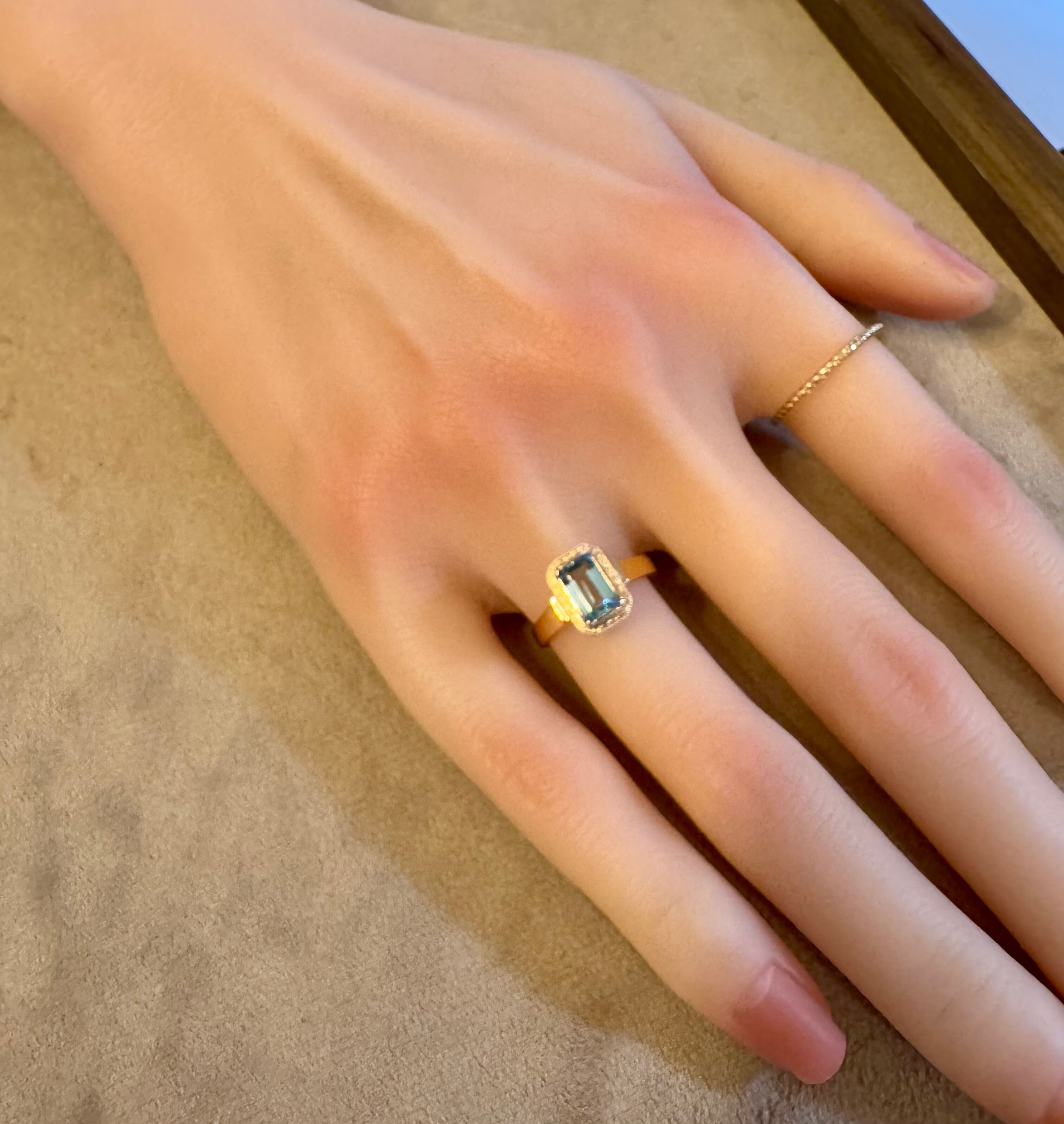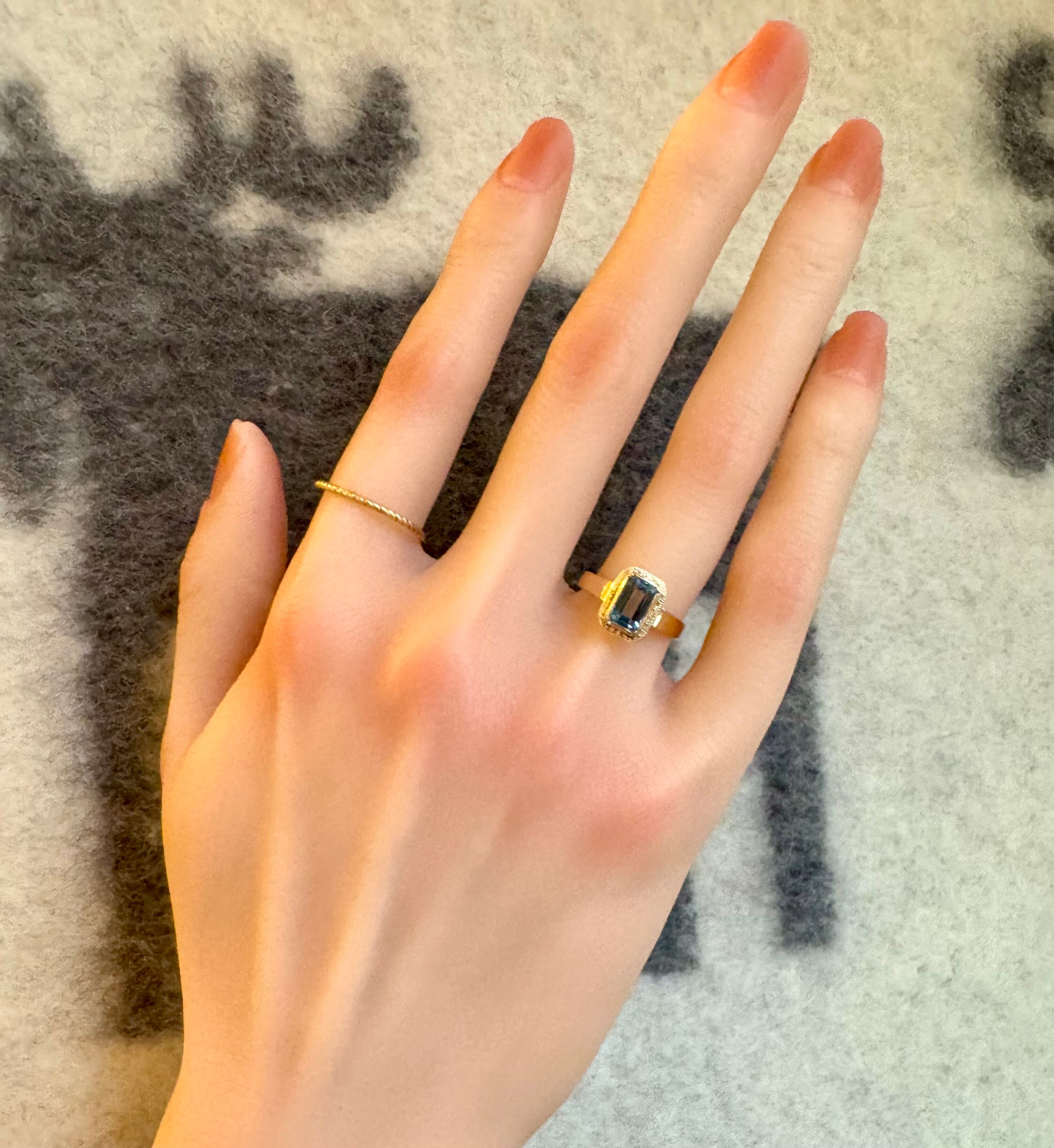 透明度が高く爽やかなブルーカラーと、石を囲い縁取るように仕上げられた地金の彫りが特徴的です。