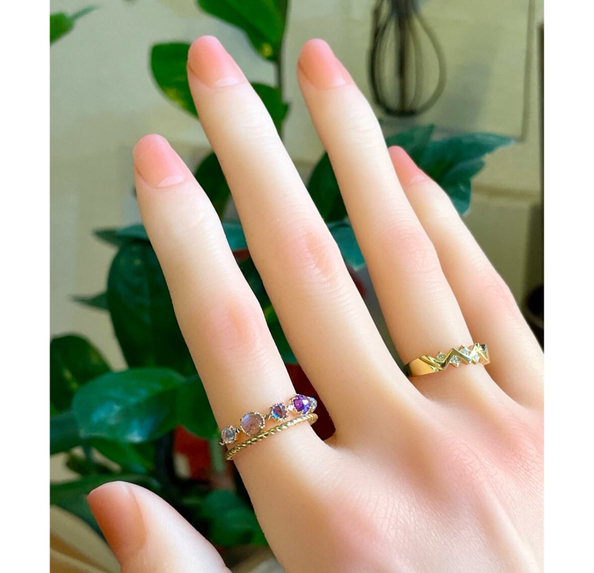 繊細なリングの間に挟んだり、1番下に持ってきて細身のリングをその上にいくつか重ねて存在感を楽しむコーディネートがおすすめです✦
