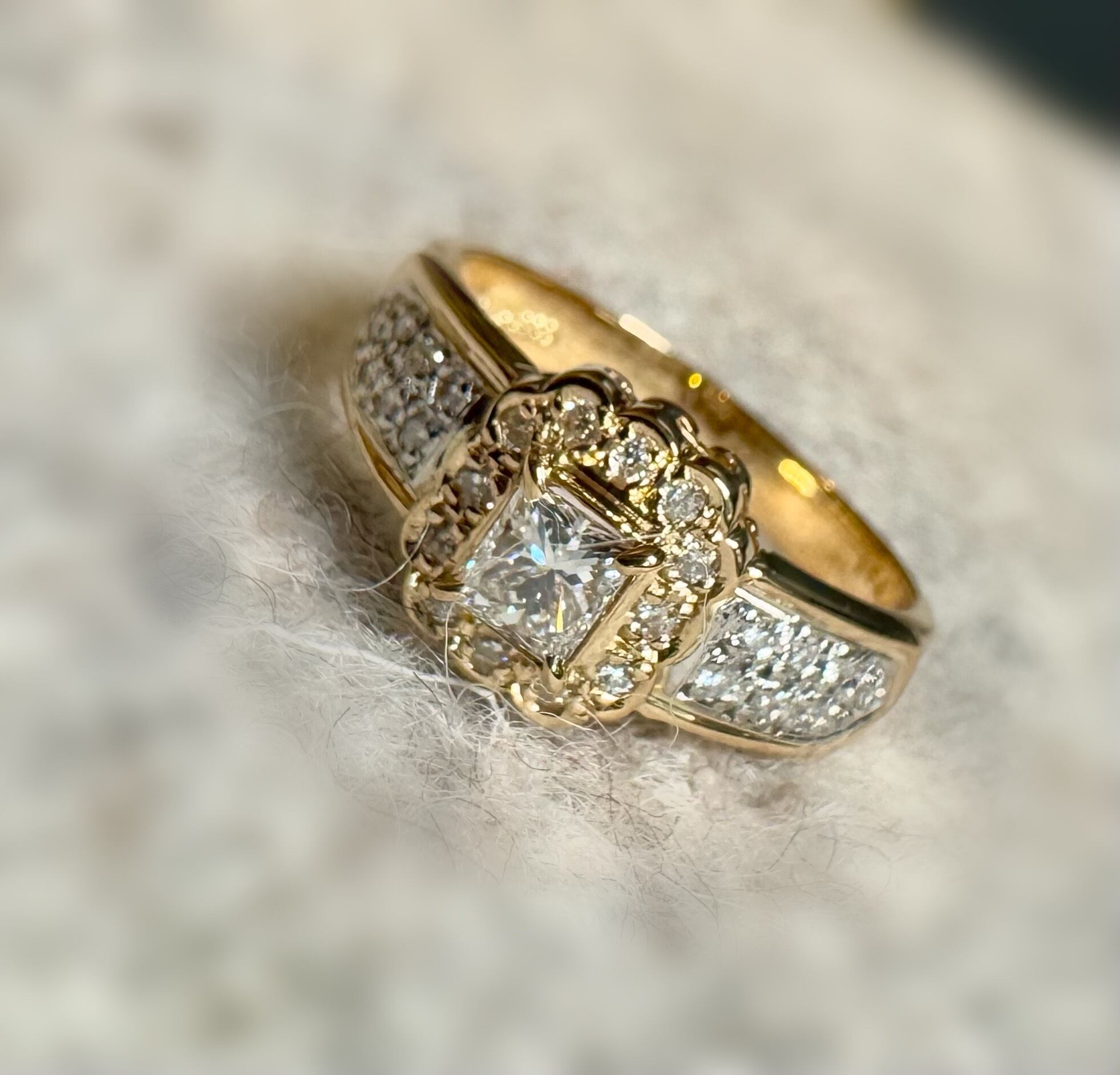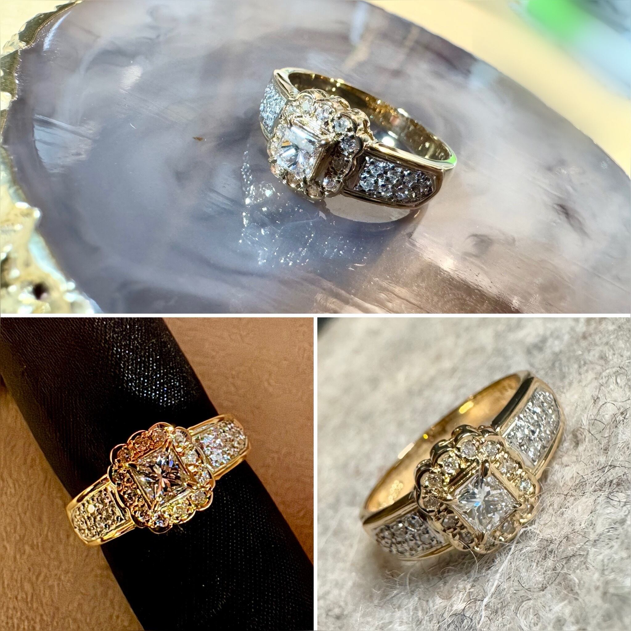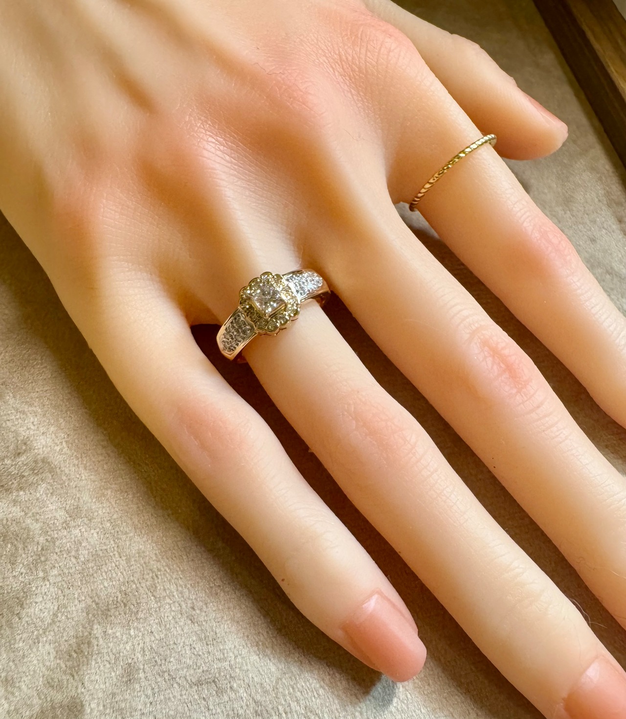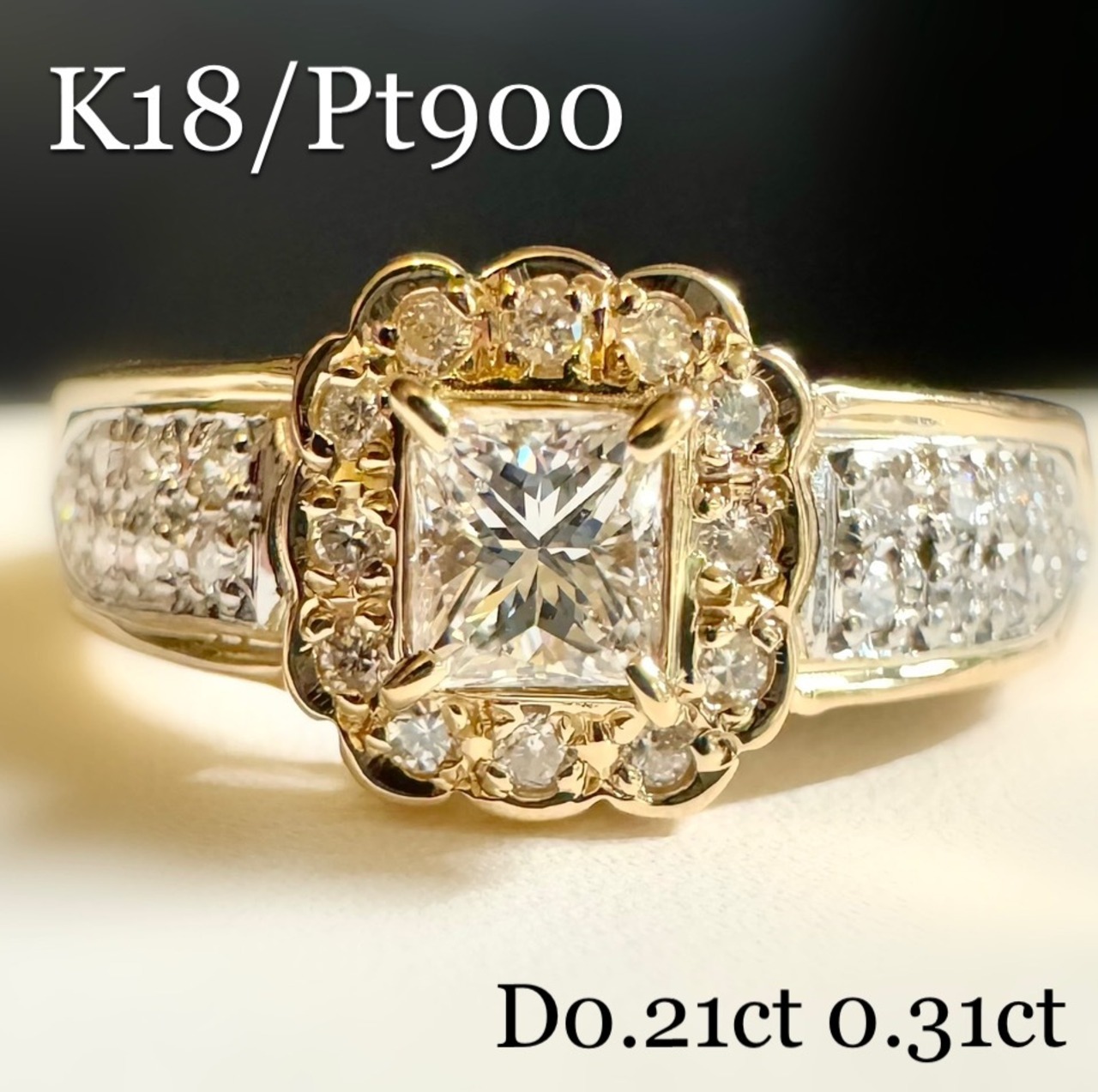 K18イエローゴールドをメインに、センターダイヤモンド(0.21ct)はプリンセスカット。肉眼でのインクルージョンは確認出来ず、カラーも透明に近くとても美しい佇まいです。